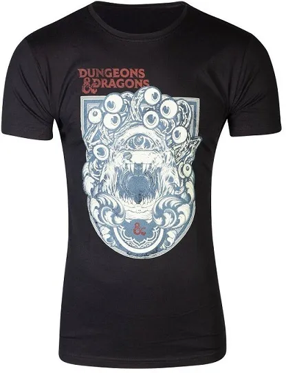 A black T-shirt with a Beholder facing the same way as the viewer.It provides a +2 bonus to intimidation rolls . Curse.The eye of the Beholder negates all luck.If a DM wears it,a TPK is inevitable.