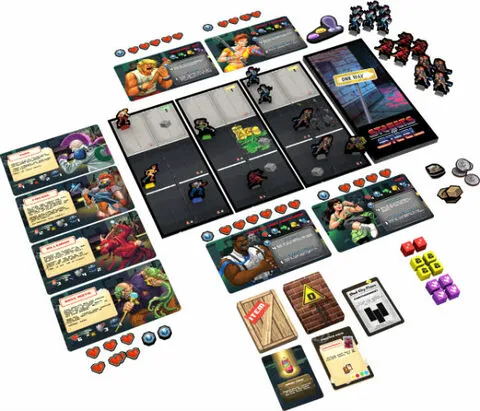 Players will join together to beat down waves of baddies by rolling lots of dice, risking lots of resources, busting crates, using items, and defeating the big boss! After each full round of Hero and Baddie activations, the game board sidescrolls… everything on the first tile dies as it is removed, and then a new tile pops in and spawns another wave of baddies!