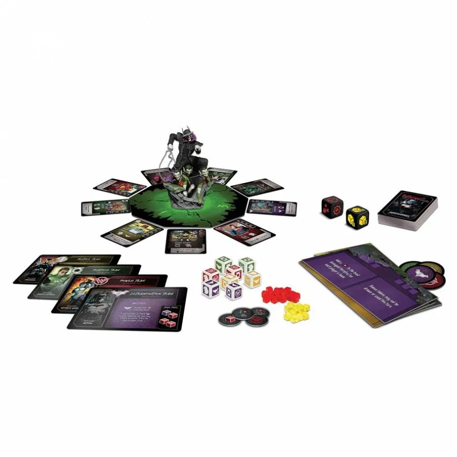 Players roll dice and work together to save the multiverse, starting with one of four starting heroes — Wonder Woman, Green Lantern, Hawkgirl, or Batman — and recruiting allies such as Harley Quinn, The Flash, and Cyborg, whose skills can complete objectives or help recover what is lost to darkness. Take out villainous versions of Batman such as The Merciless, The Dawnbreaker, The Murder Machine, and more before facing off with the psychotic Joker-ized antagonist himself, who's represented by a custom-sculpted, full-color figure who commands a fistful of chained Evil Robins!