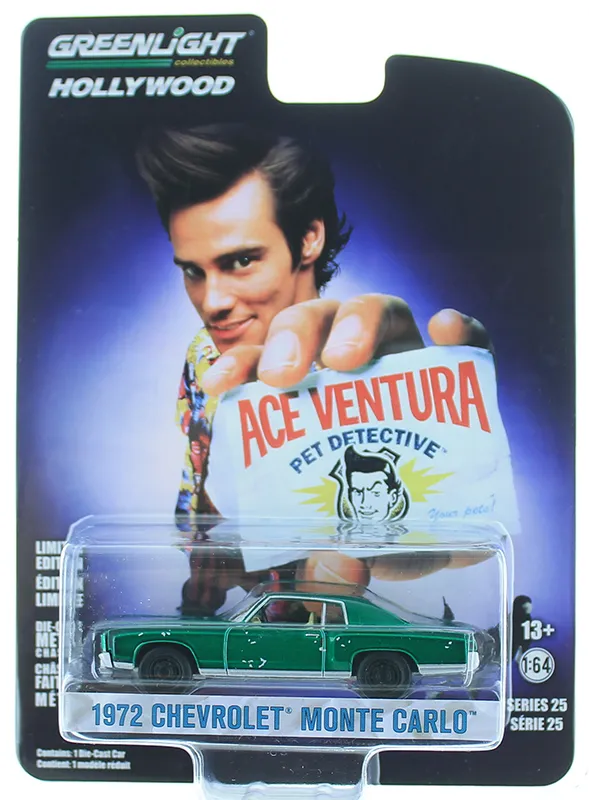 Brand new 1/64 scale diecast car model of 1972 Chevrolet Monte Carlo Light Blue (A Beat Up) "Ace Ventura: Pet Detective" (1994) Movie "Hollywood Series" Release 25 die cast model car by Greenlight. Limited edition. Brand new box. Chrome accents. Real rubber tires. True-to-scale detail. Authentic decoration. Detailed interior, exterior. Comes in a blister pack. Officially licensed product. Die-cast metal body and chassis.