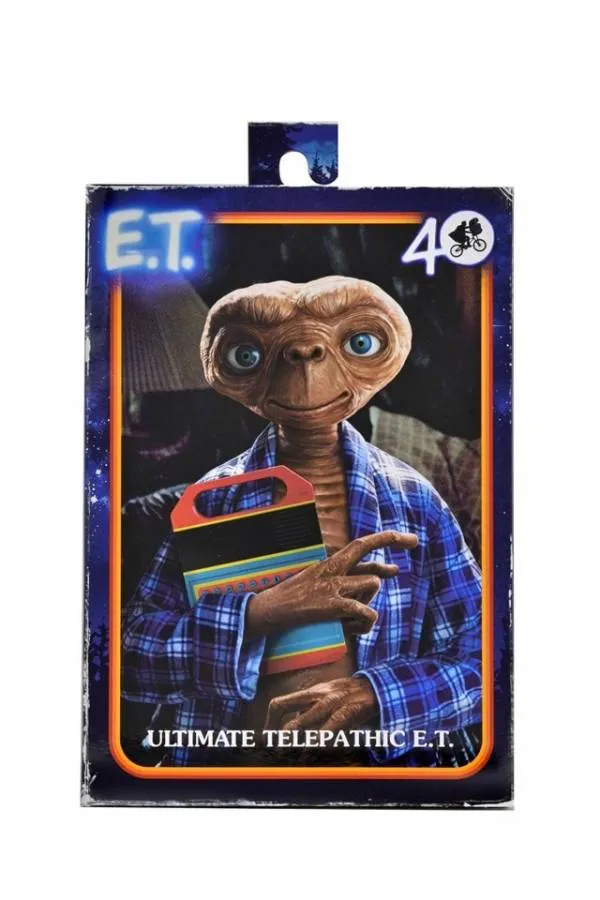 This Ultimate action figure celebrates the 40th anniversary of the beloved classic! Bring the magic and excitement of E.T. The Extra-Terrestrial into your world. As your friendship with E.T. grows, relive all of his earthly encounters or look to the stars and create your own unforgettable interactive adventures. Ultimate Telepathic E.T. features incredible life-like detail and wears the blue plaid shirt from the home scenes. E.T. stands in 7" scale (meaning the figure is about 4.5" tall) and is posable. Includes Speak & Spell, phone, and TV remote, plus interchangeable necks and hands. Comes in display-friendly 40th anniversary window box packaging with opening front flap.