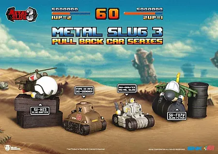 When it comes to the huge selection of detailed war machines in the game, METAL SLUG never disappoints. Beast Kingdom is proud to introduce a set of miniature pull back cars based on the 'Super Vehicles' found in the game. Two Tanks, the iconic SV-001/? Metal Slug and the Type II AFV Di-Cokka are joined by the SV-F07V Slug Flyer aircraft and the SV-H03 Slug Copter. Each pull back car is manufactured with a focus on detail and design, bringing to life the fun and unique vehicles from the game. Not forgetting a great little set of wheels on each to get your friends racing to the finish line. Make sure all four are collected and bring some nostalgic shooting fun to a desk near you!