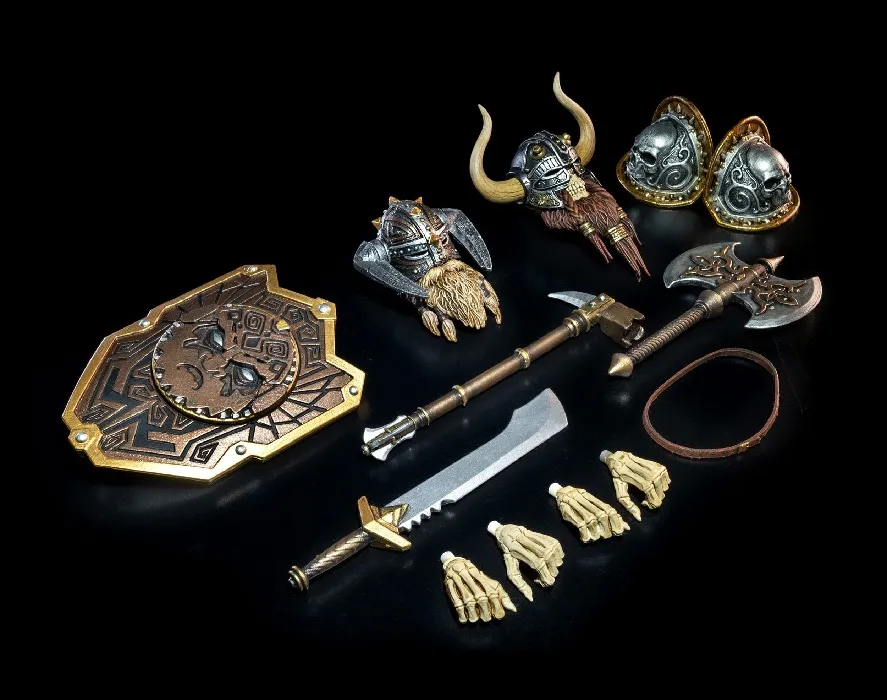 Skalli Bonesplitter was once one of the most ruthless raiders in the Nordic village of Vikenfell . After succumbing to the curse that afflicted these warriors, his cruelty intensified in death. He now leads a horde of skeletal raiders, spreading terror in their wake toward the heart of Mythoss . This 6-inch figure is sculpted from high-quality PVC and is fully articulated. It comes with a full range of accessories.