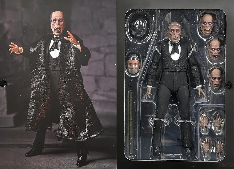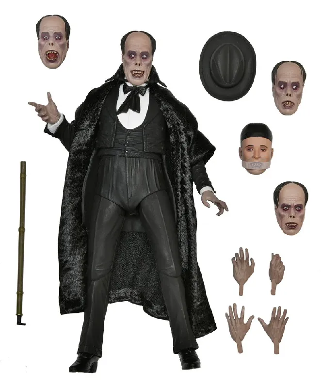 Celebrating more horror legends, NECA is excited to reveal The Phantom of the Opera! Starring Lon Chaney, the 1925 silent movie was famed for the shocking appearance of the Phantom, which Chaney created himself and kept secret until the premiere. Almost a century later, the thriller is still critically acclaimed and was added to the United States National Film Registry in 1988 for its historical and cultural significance. The 7" scale figure captures the Phantom both disguised and unmasked with five interchangeable heads, and also includes fabric cloak, bamboo stick and hat accessories. Display-friendly window box packaging with opening front flap.
