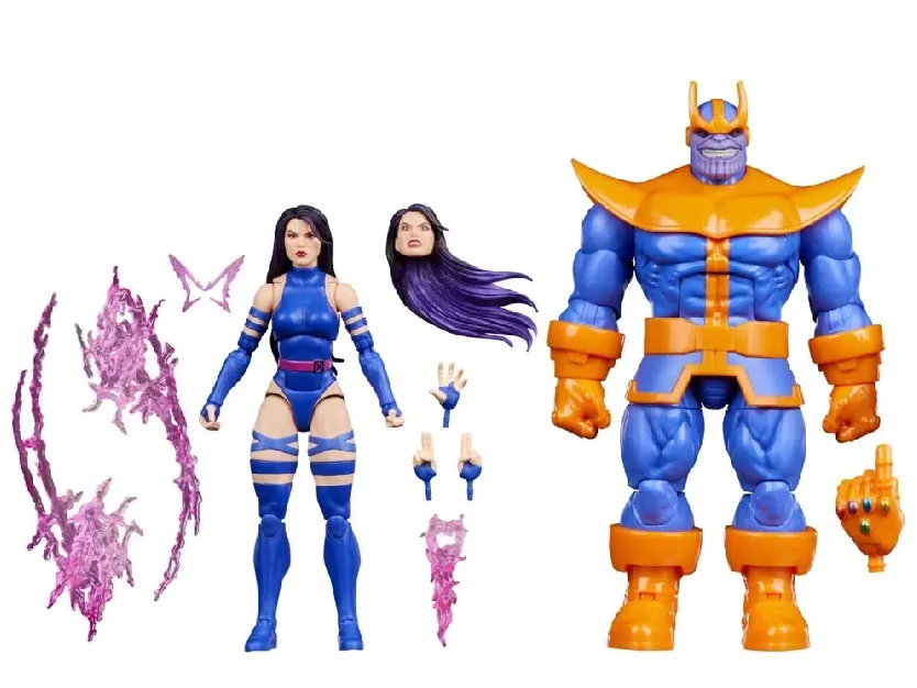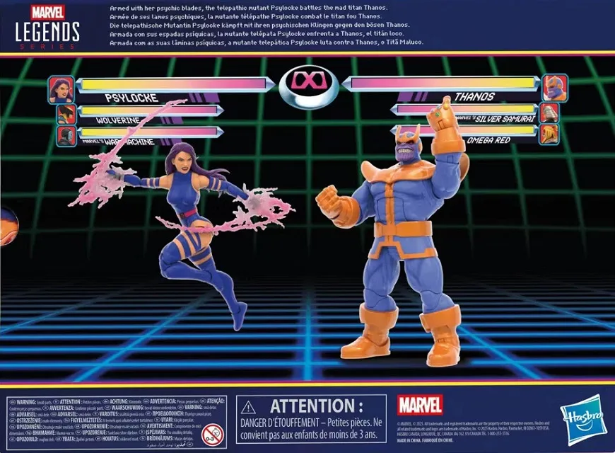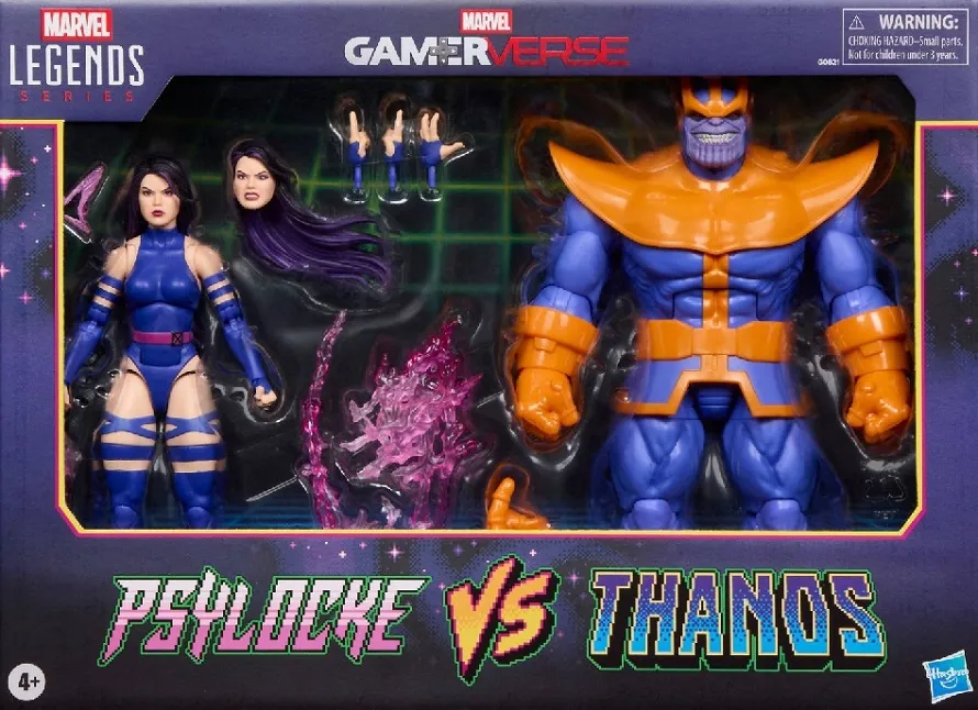Bring the excitement and wonder of the Marvel Universe to your collection with Hasbro Marvel Legends Psylocke and Thanos action figures! These collectible 15 cm scale Marvel figures are inspired by the characters’ appearance in classic Marvel video games. Figures are fully articulated with premium design and poseable heads, arms, and legs. Marvel action figure set comes with 9 accessories, including attachable power FX pieces for Psylocke and alternate hands for both figures.