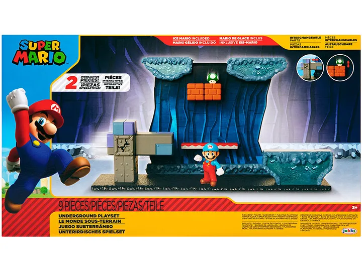 Continue your Super Mario adventures with the Underground Playset from the popular video game series. This playset includes a mini Mario figure and features a brick block with mushroom pop-up action and a shifting platform.