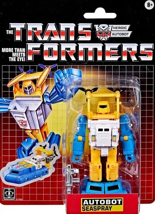 Re-experience the nostalgia of your favorite G1 action figures with the Transformers Retro Autobot Seaspray toy! Toy converts from robot to boat in 22 steps. Seaspray displays a zest for his job unmatched by fellow Autobots. He loves the ocean and its creatures, and he loves the thrill of naval battle. Transformers Retro G1 action figures feature vintage styling, accessories, and special package art and tech specs. Clip out and save the on-box tech specs to share, then see how this figure stacks up against other heroic Autobots and evil Decepticons.
