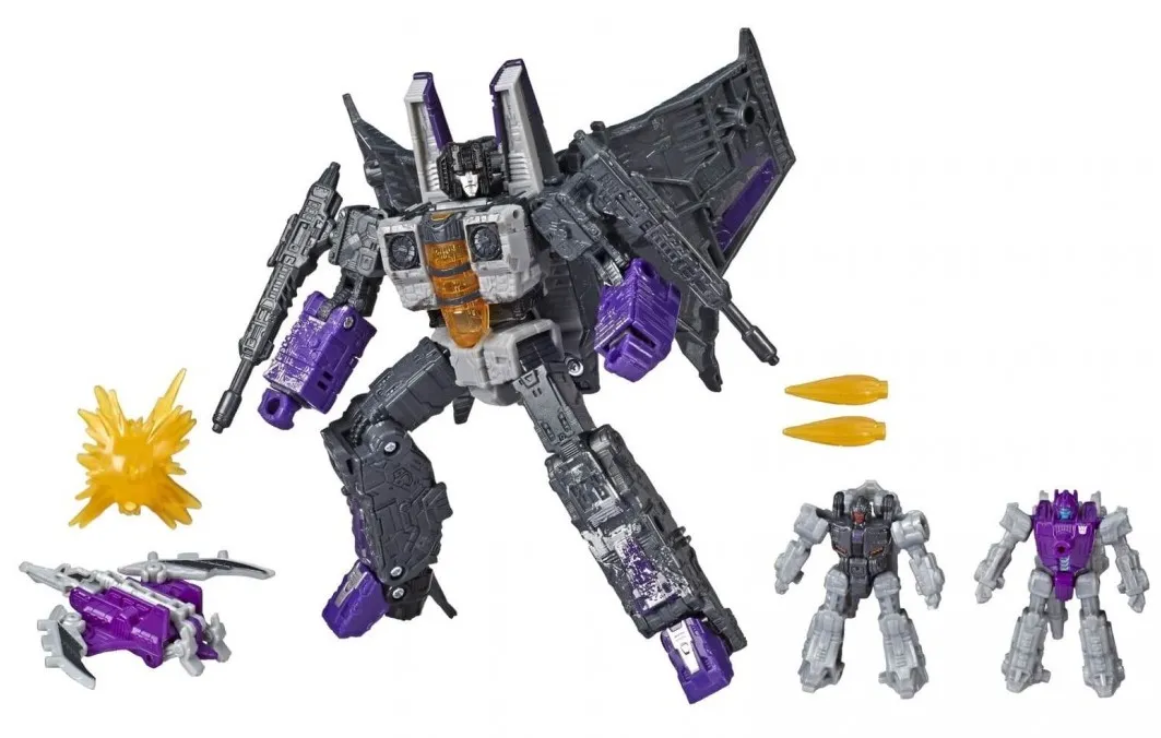 Hasbro presents this 4-pack of Decepticon Phantomstrike Squadron figures. It includes Skywarp (20 cm) and 3 Battle Masters figures: Shrute, Fracas and Terror-Daxtyl. They are based on Siege, the first chapter of the "Transformers: War for Cybertron" trilogy. It includes 2x weapons that can be attached to the figures and 3x battle effects to simulate discharges.