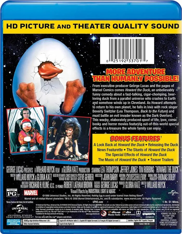 From executive producer George Lucas and the pages of Marvel Comics comes Howard the Duck, an unbelievably funny comedy about a fast-talking, cigar-chomping, beer-loving duck from a parallel universe who crashes to Earth and somehow winds up in Cleveland. As Howard attempts to return to his own planet, he falls in love with rock singer Beverly Switzler (Lea Thompson, Back to the Future) and must battle an evil invader known as the Dark Overlord. This wacky, elaborately produced spoof of life, love, comic books and horror movies featuring out-of-this-world special effects is a treasure the whole family can enjoy.