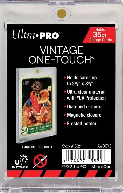 The Vintage ONE-TOUCH is a premium storage & display designed as the final destination for your collectible trading cards. The two-piece ONE-TOUCH holders are uniquely designed with slide-in hinges and magnetic closure so you'll never have to use a screwdriver again. The holder uses UV-blocking additives to protect your card from harmful UV-rays, and is made with non-PVC materials to provide acid-free protection - ensuring your valuable hit retains its condition while under display. This model can hold vintage size cards (2 in. x 3 in.) up to 35pt in thickness.